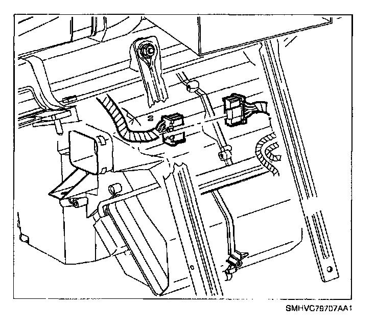 5. Remove HVAC module electrical harness connectors from mode actuator, blower resistor card, and recirculation actuator. Pull blower motor harness grommet out of case.
