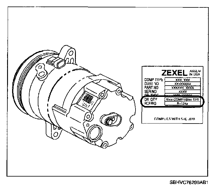 BALANCING COMPRESSOR OILNOTE: PAG oil charge can be identified by locating the label on the rear of A/C compressor. (220 cc oil charge in the total system for the model year serviced.) Improper quantity of oil charge in the system will degrade performance.