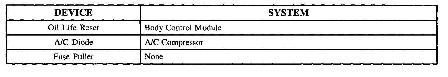 The chart lists the devices located in the underhood fuse block, and the systems they control.