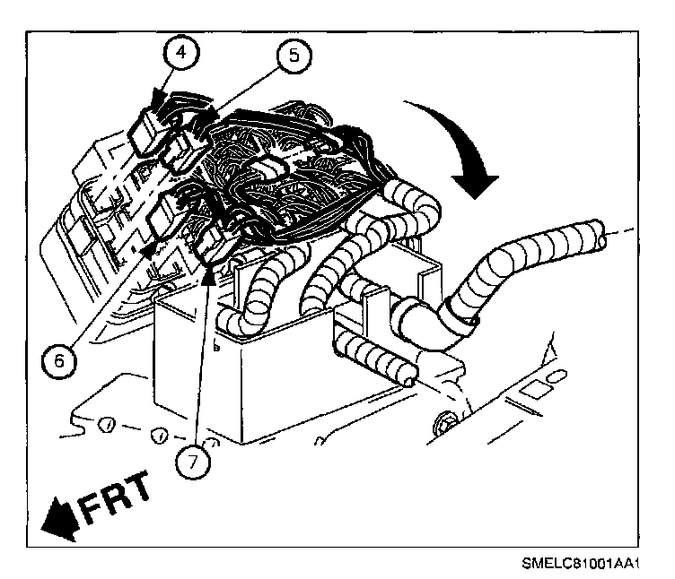 13. Remove routed harnesses. (Engine (A), Forward Lamp (B), and I/P (C).)