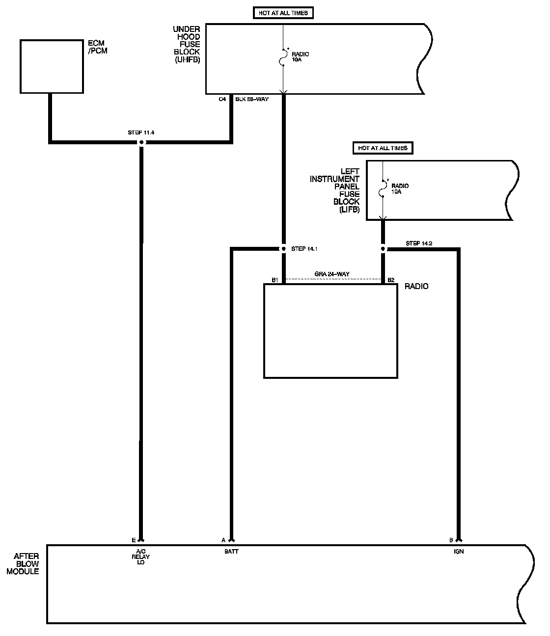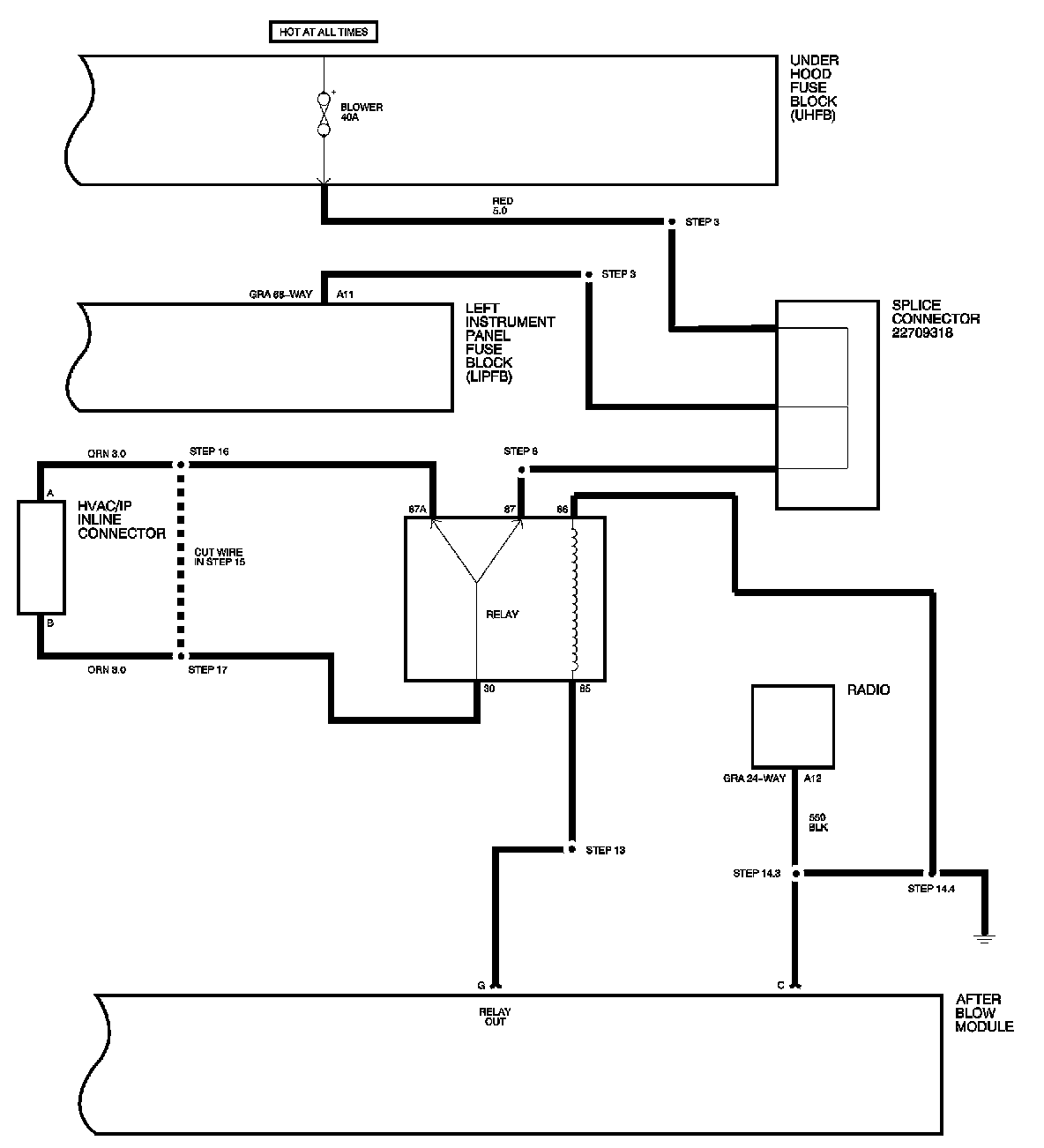 For 2004 model year vehicles: splice the RED wire from pin B at the after blow module into YEL .35 mm (22 gage) wire (circuit 43) in cavity B11 using a salmon splice sleeve.