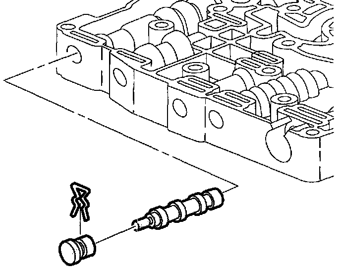 7. Install accumulator valve, plug, and 1-2/3-4 accumulator valve retainer clip.