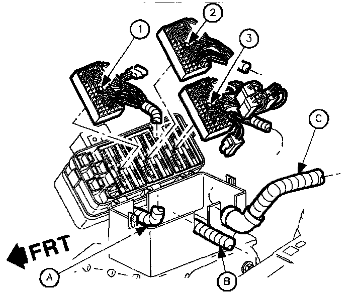 6. Release retaining tabs (2) on UHFB and roll fuse block back (1) to access electrical connectors.