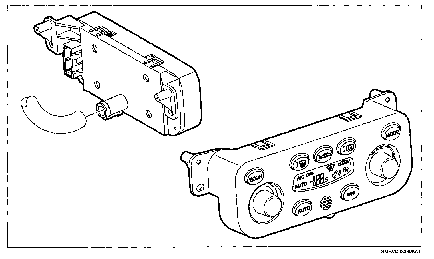 The operation of the automatic A/C and heating system is controlled by the buttons, rotary switch, and knobs on the HVAC control head. The compressor clutch, rear defog and recirc motor are controlled electrically by push buttons on the control head.