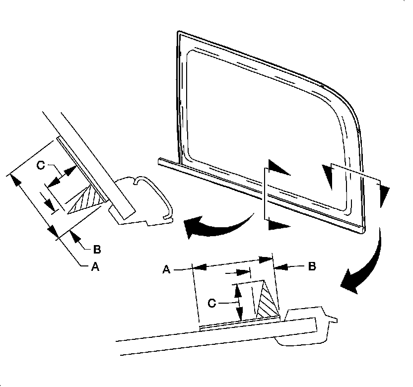 Important: The bodyside glass must be installed to the bodyside opening within 5 minutes after the urethane adhesive is dispensed.