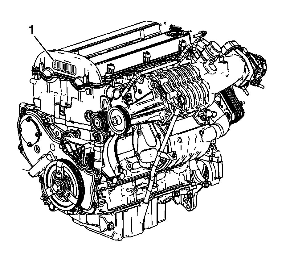 Identification can be made through the use of the Broadcast Code label on the engine front cover (1) and the use of the partial VIN etched on the oil filter bowl (2).
