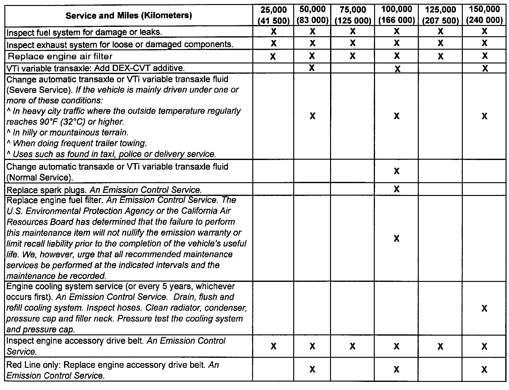 (Maintenance I or Maintenance II) after the indicated kilometers (miles) shown for each item.