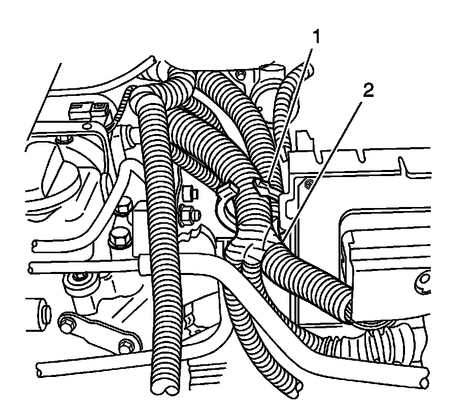 7. Release the engine wiring harness retainer (1), next to the engine control module (ECM). Reposition the wiring harness (2) toward the engine.
