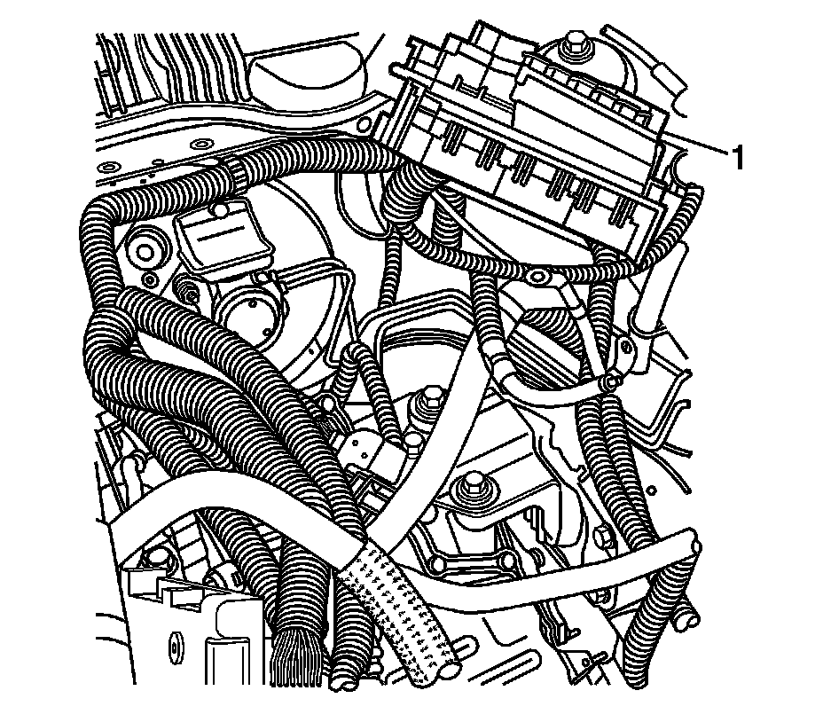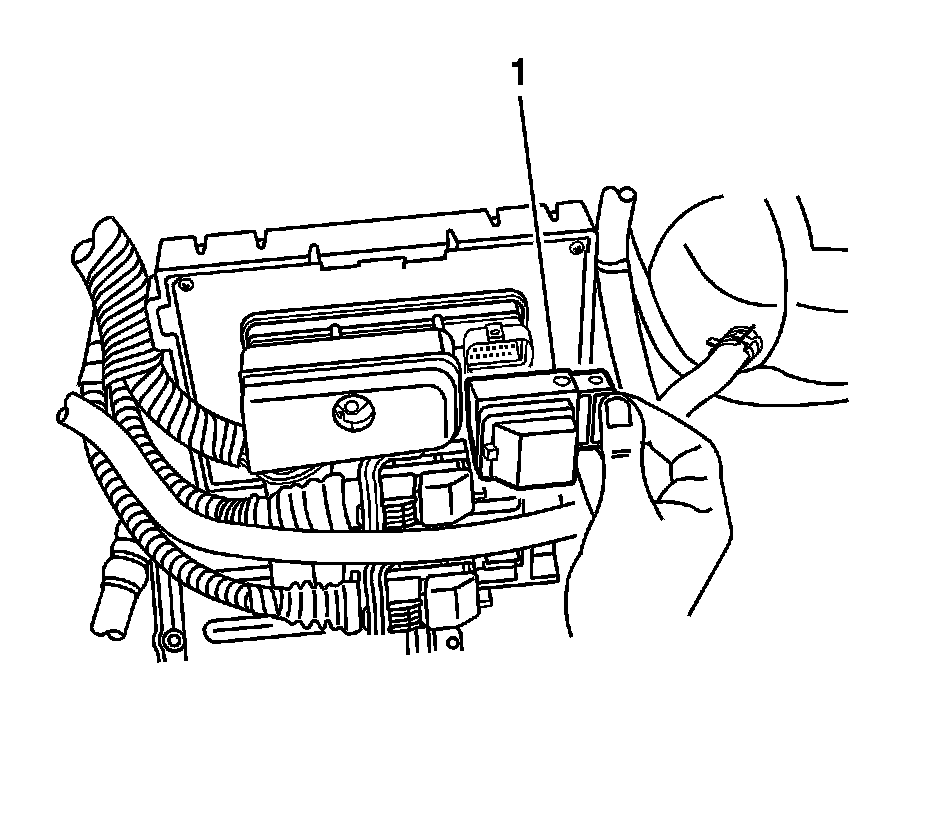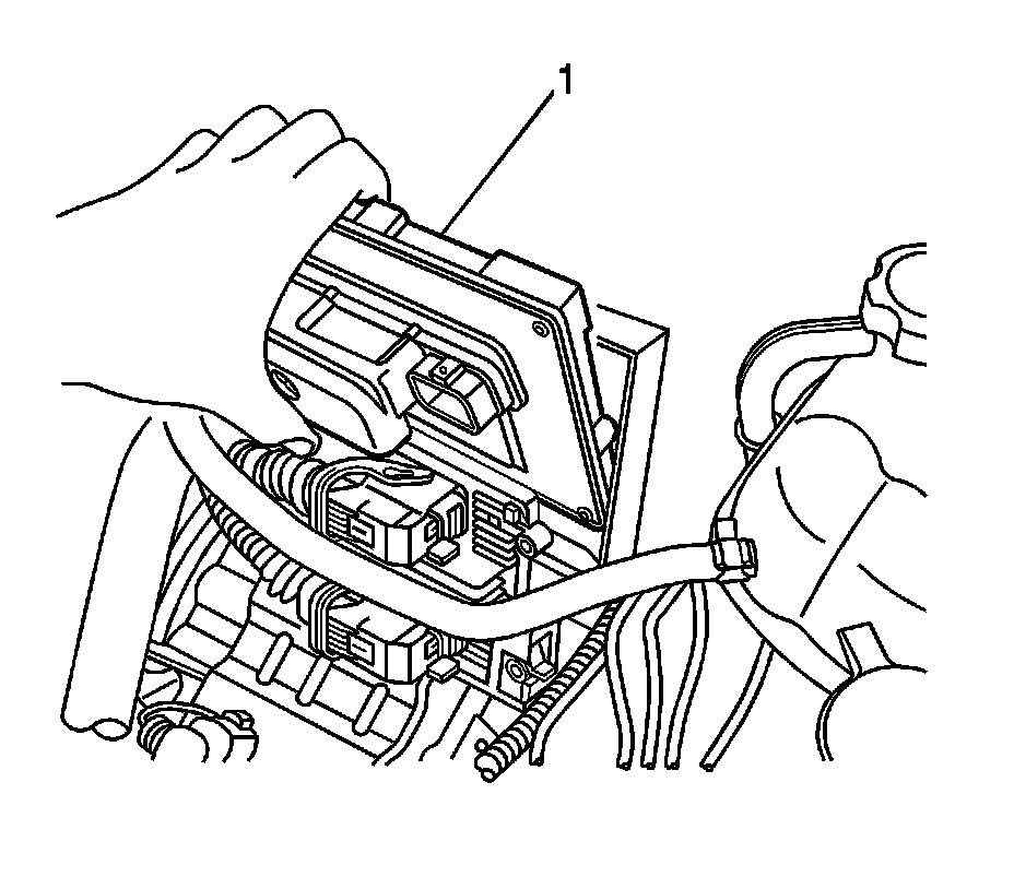 9. Remove the ECM (1) from the underhood electrical center bracket, and reposition the module with harness, toward the engine.