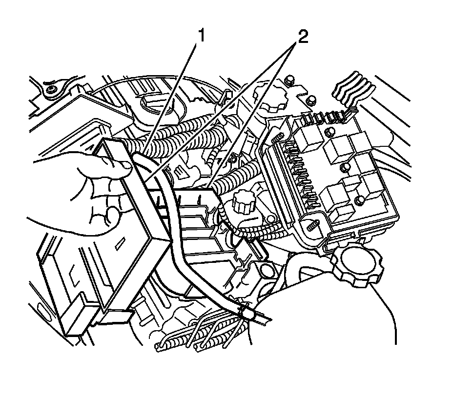3. Release the retainer from the underhood electrical center and position the electrical center (2) to the electrical center bracket.