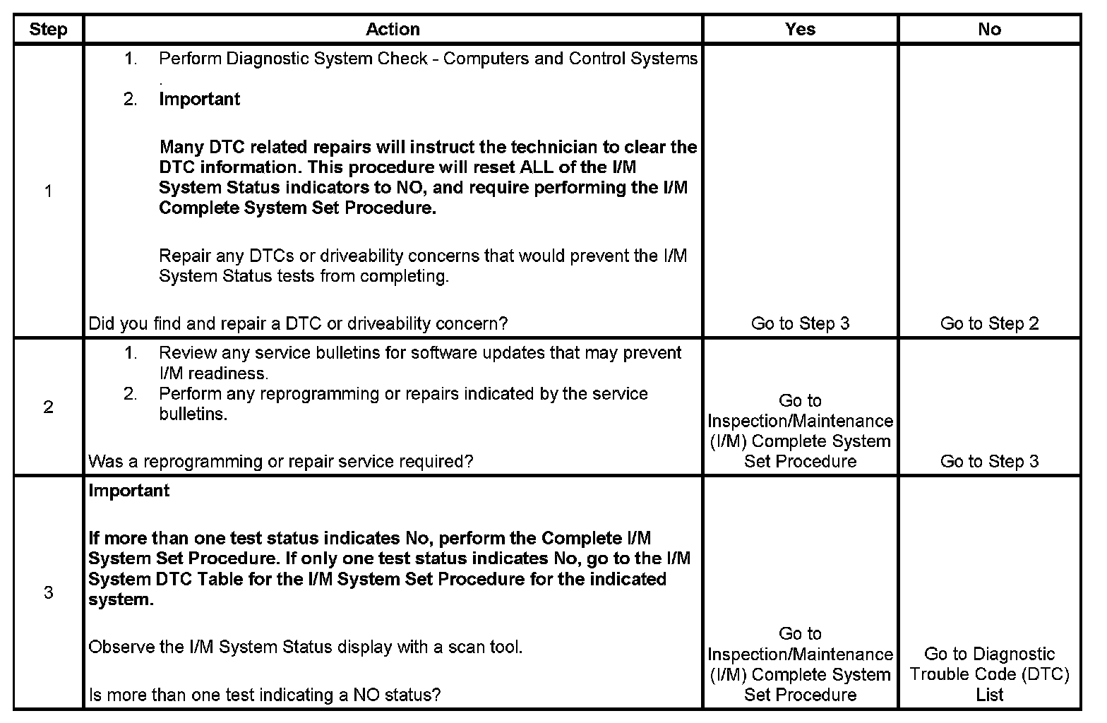 For the specific DTCs required for each system, refer to Inspection/Maintenance (I/M) System DTC Table. Inspection/Maitenance (I/M) System (DTC) Table Systems such as fuel delivery, misfire, and comprehensive components may not be listed in a system status list. These tests run continuously and do not require an I/M System Status indicator.