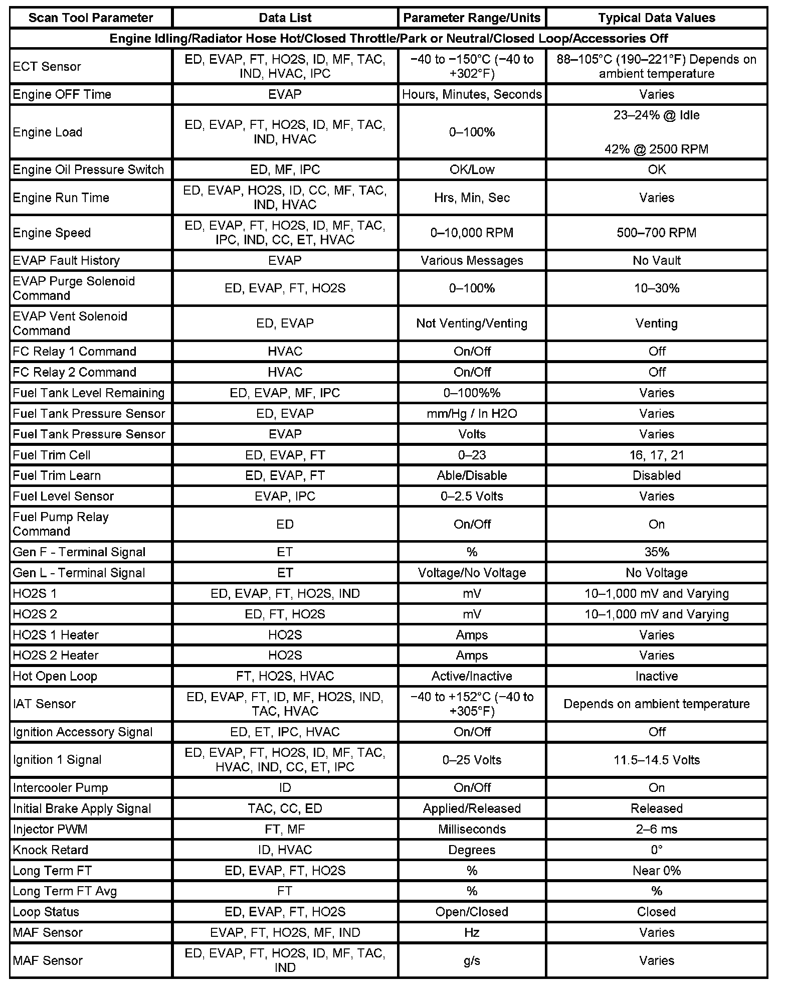 The Engine Scan Tool Data List contains all engine related parameters that are available on the scan tool. The list is arranged in alphabetical order. A parameter may appear in any one of the data lists, and in some cases may appear more than once, or in more than one data list in order to group certain related parameters together.
