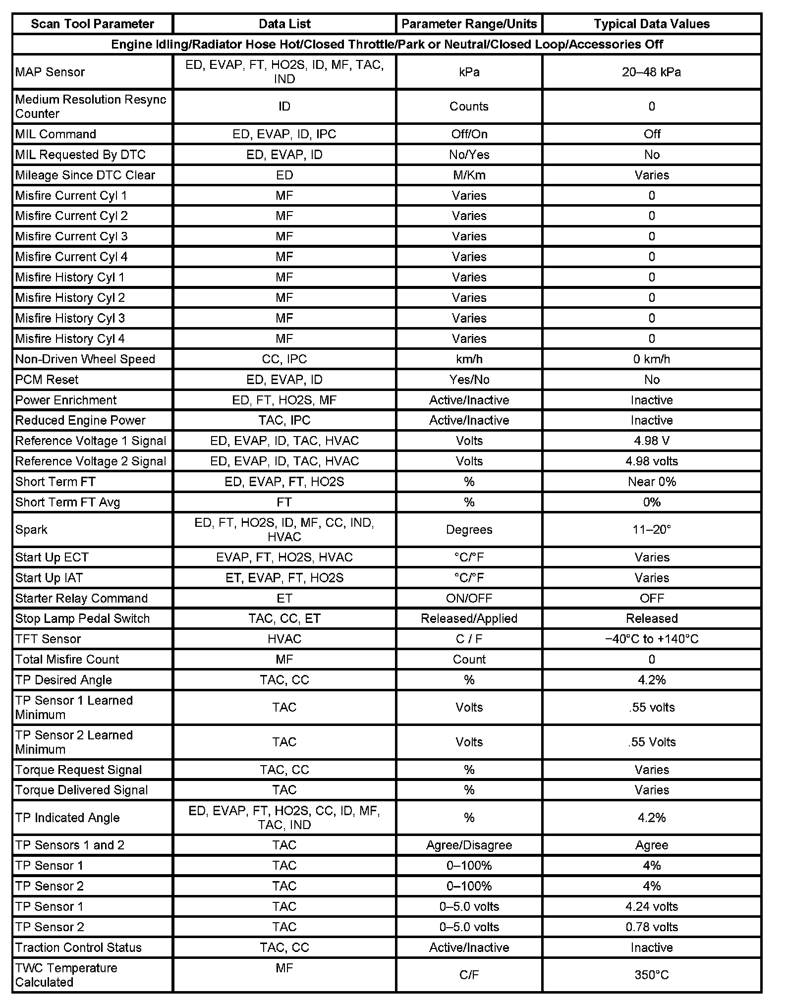 Only the parameters listed below are referenced in this Service Data for use in diagnosis. If all values are within the typical range described below, refer to Symptoms - Computers and Control Systems for diagnosis. Symptom Related Diagnostic Procedures