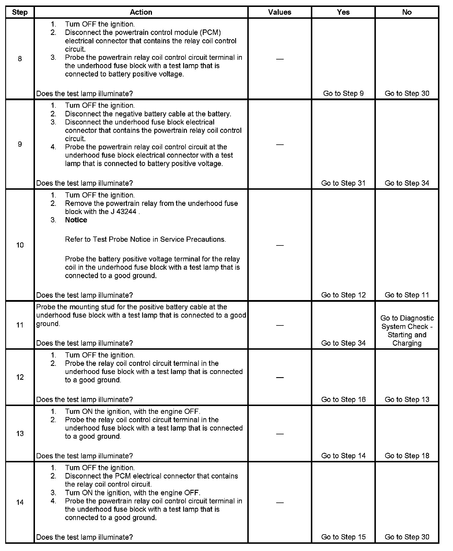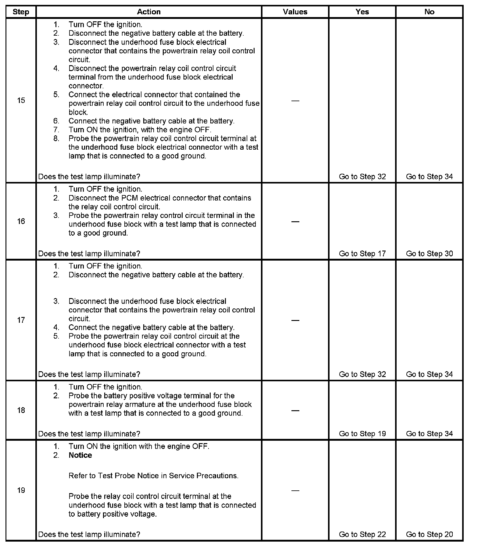 The powertrain relay system diagnosis table assumes that the vehicle battery is fully charged.