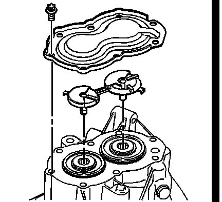 11. Install the output shaft bearing race and bolts using the J44387-1 (2), J44387-2 (3), and the J7079-2 (1).