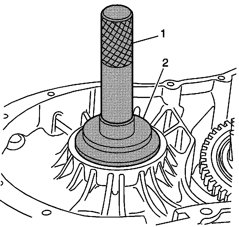 6. Install a new differential bearing race to the transmission housing using the J44385 (2) and the J7079-2 (1).