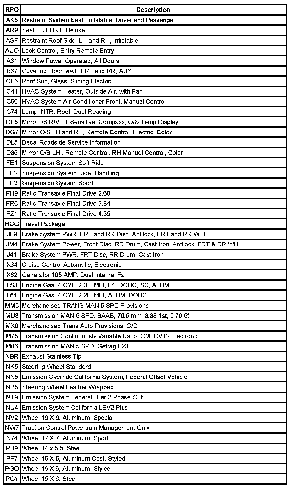 RPO Codes