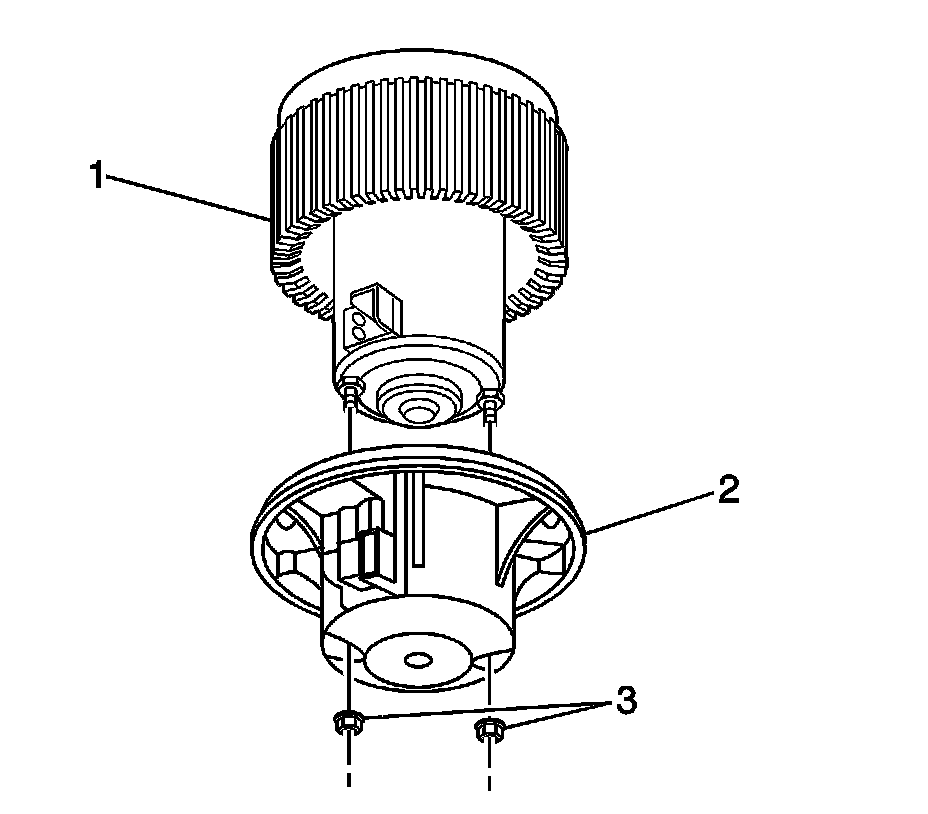 1. Install the blower motor (1) into the motor cup (2) that was cut out of the lower case.