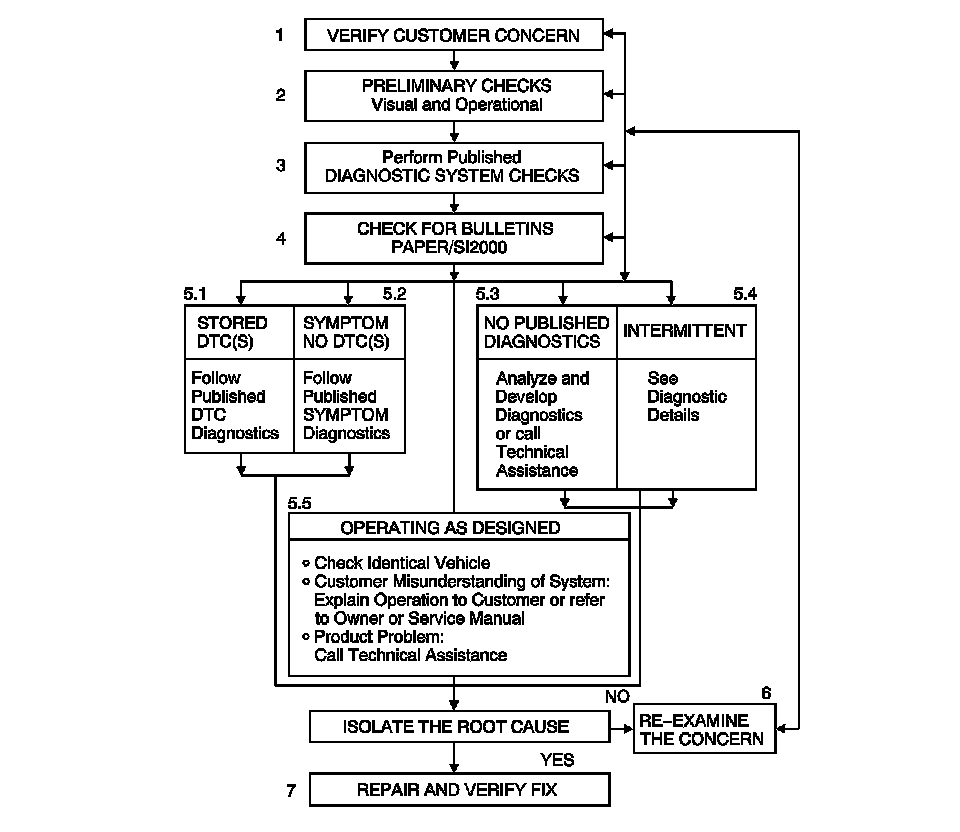 6. Re-examine the Concern: If a technician cannot successfully find or isolate the concern, a re-evaluation is necessary. Re-verify the concern. The concern could be an intermittent or normal.