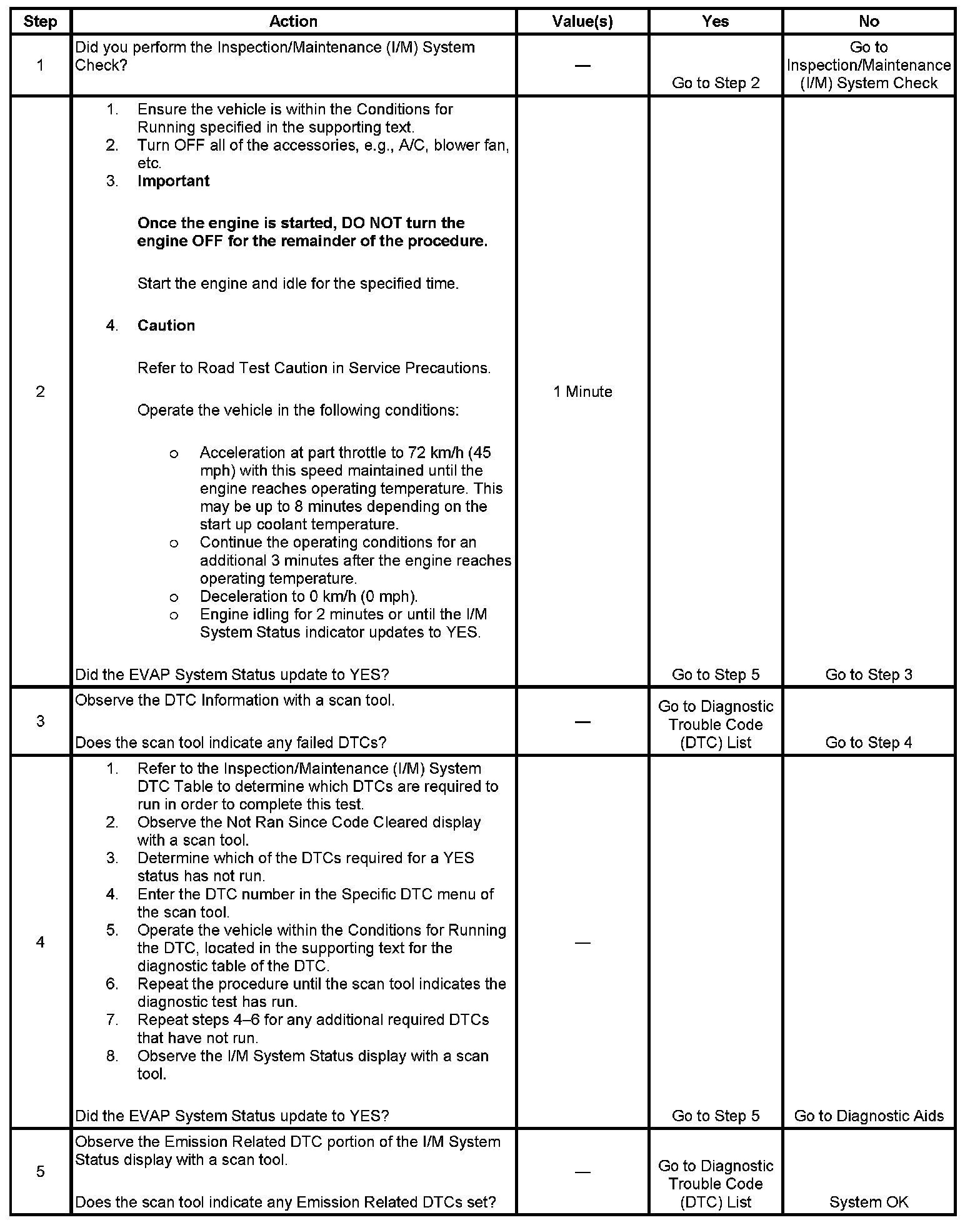 The purpose of this test is to satisfy the enable criteria necessary to execute I/M readiness diagnostics for the evaporative emission (EVAP) system. The test may be used to set the I/M System Status indicators to YES. The I/M System Status Display on the scan tool provides and indication of whether the control module has completed the required tests. The I/M System Status does not indicate that the tests have passed or failed. When all of the diagnostics for a specific system have run and passed the I/M System Status will update to YES. If a test for a specific system has failed, the I/M System Status will update to YES, indicating a determination was made, even if all of the other tests for that system have not run. Performing a visual inspection prior to running the EVAP test may prevent having to repeat the test. A failed or aborted test will require the vehicle to cool down in order to meet the enable criteria to run another test.