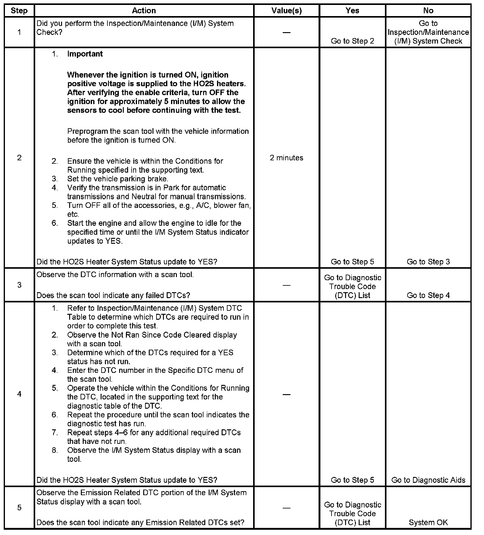 The purpose of this test is to satisfy the enable criteria necessary to execute I/M readiness diagnostics for the heated oxygen sensor (HO2S) system. The test may be used to set the I/M System Status to YES. The I/M System Status Display on the scan tool provides an indication of whether the control module has completed the required tests. The I/M System Status does not indicate that the tests have passed or failed. When all of the diagnostics for a specific system have run and passed the I/M System Status will update to YES. If a test for a specific system has failed, the I/M System Status will update to YES, indicating a determination was made even if all of the other tests for that system have not run.