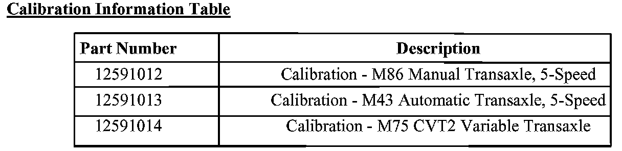 ^ If the current ECM calibration ID is the same or later than the calibration listed in the "Calibration Information Table," do not reprogram the ECM. The updated calibration is already installed and reprogramming is not required.