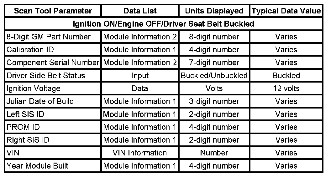 SCAN TOOL DATA LISTThe SIR scan tool data list contains all the restraint system related parameters that are available on the scan tool. The parameters in the list are arranged in alphabetical order. The column, Data List, indicates the location of the parameter within the scan tool menu selections.