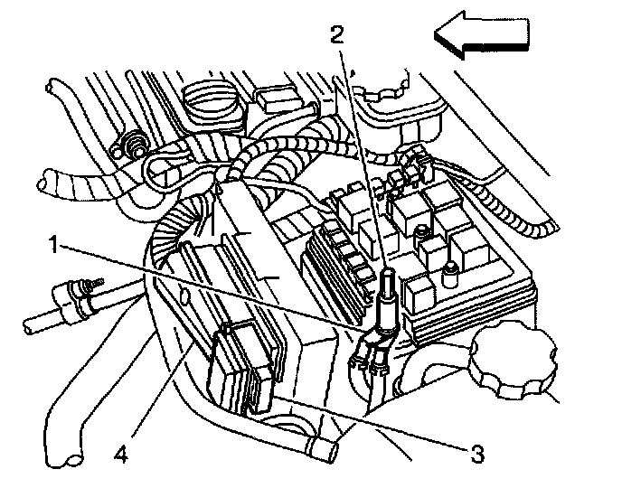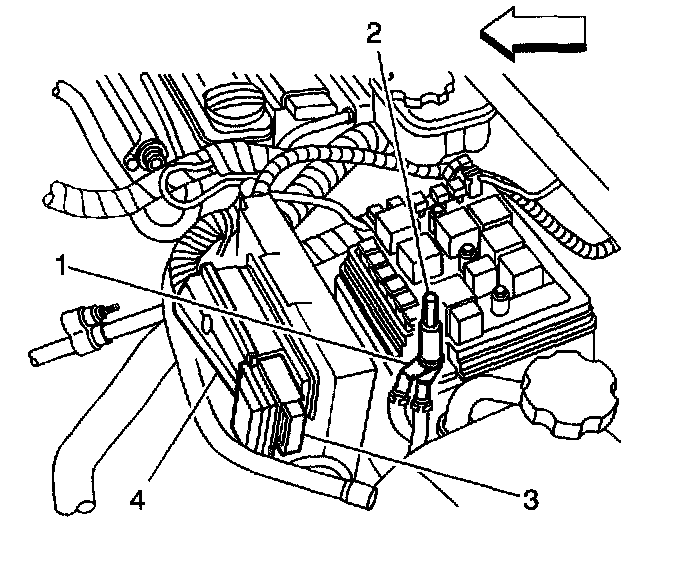 4. Remove the bolt and disconnect the large engine control module connector (4).