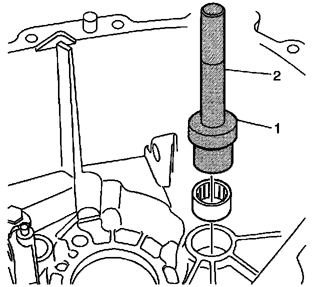 2. Install the intermediate shaft needle bearing to the transmission housing using the J 44383 (1) and the J 8092 (2).