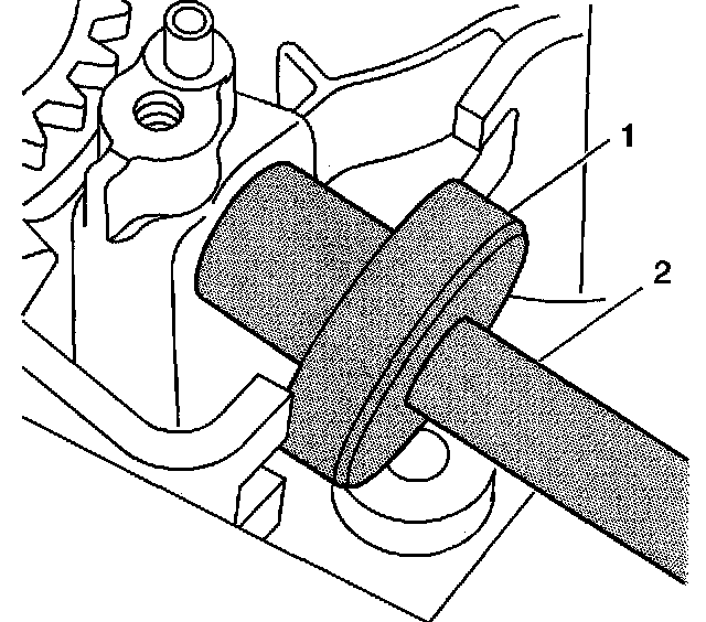 3. Install a new shifter shaft bearing flush with the casting in the transmission housing, using the J 44381 (1) and the J 8092 (2).