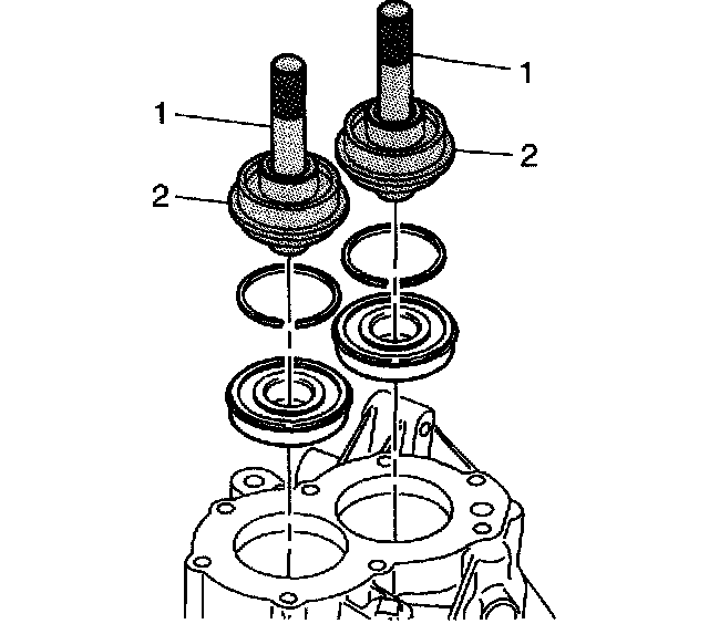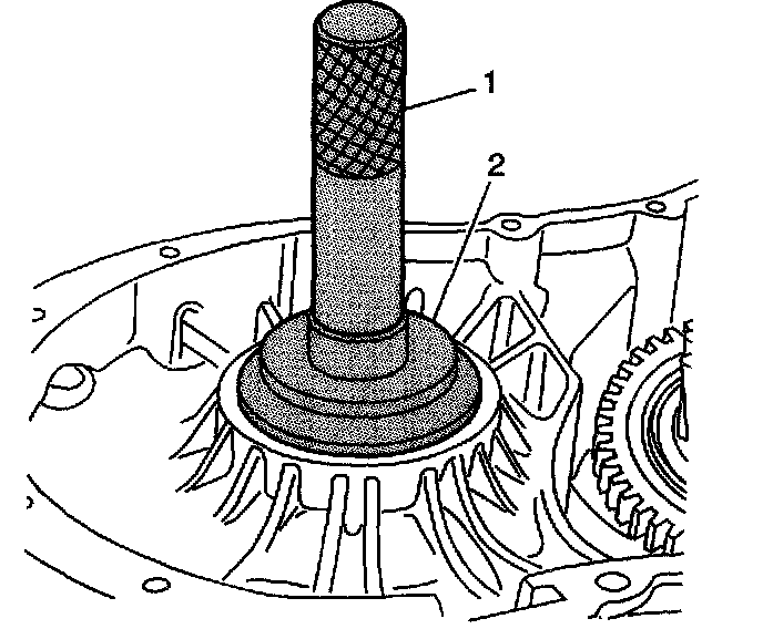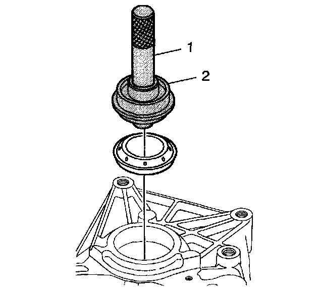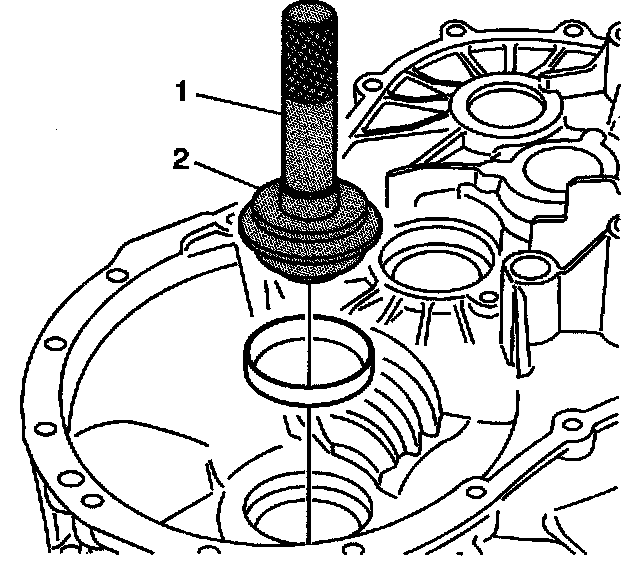 7. Install a new differential side bearing race seal to the transmission housing using the J 44385 (2) and the J 7079-2 (1).