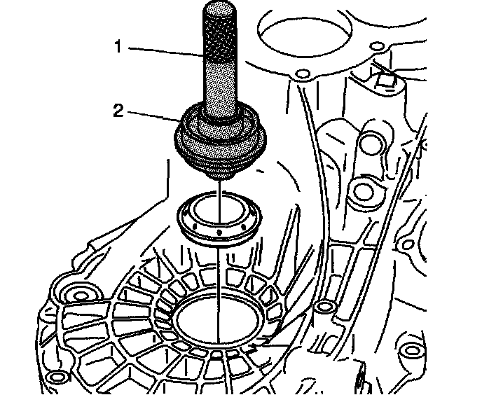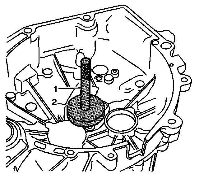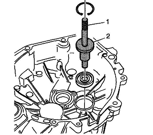 6. Install a new differential bearing race to the transmission housing using the J 44385 (2) and the J 7079-2 (1).