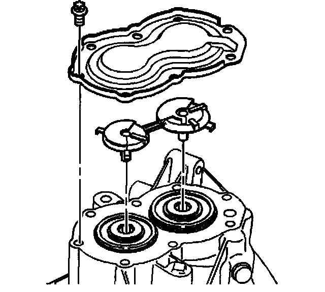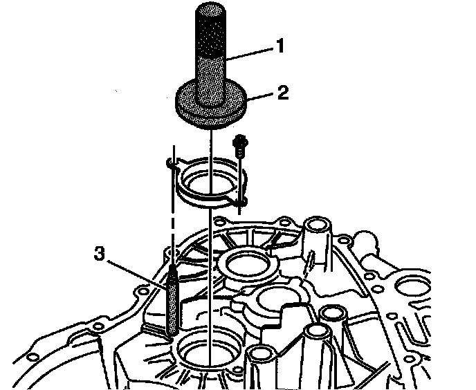 11. Install the output shaft bearing race and bolts using the J 44387-1 (2), J 44387-2 (3), and the J 7079-2 (1).
