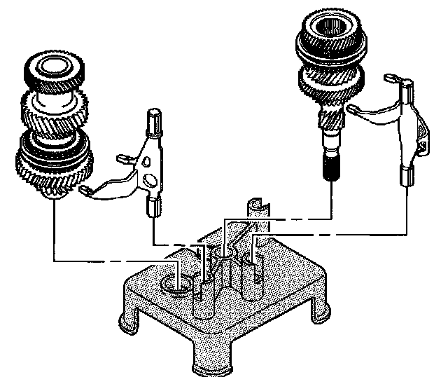 16. Install the shift forks and the input shaft and output shaft onto the J 44375.