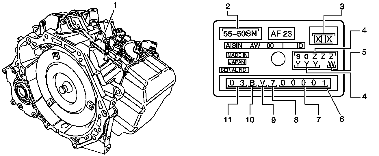 2. Locate metal transaxle identification tag (1), and identify the transaxle part number (4). The transaxle part number will be needed to reference the calibration information table shown for the correct calibration identification.