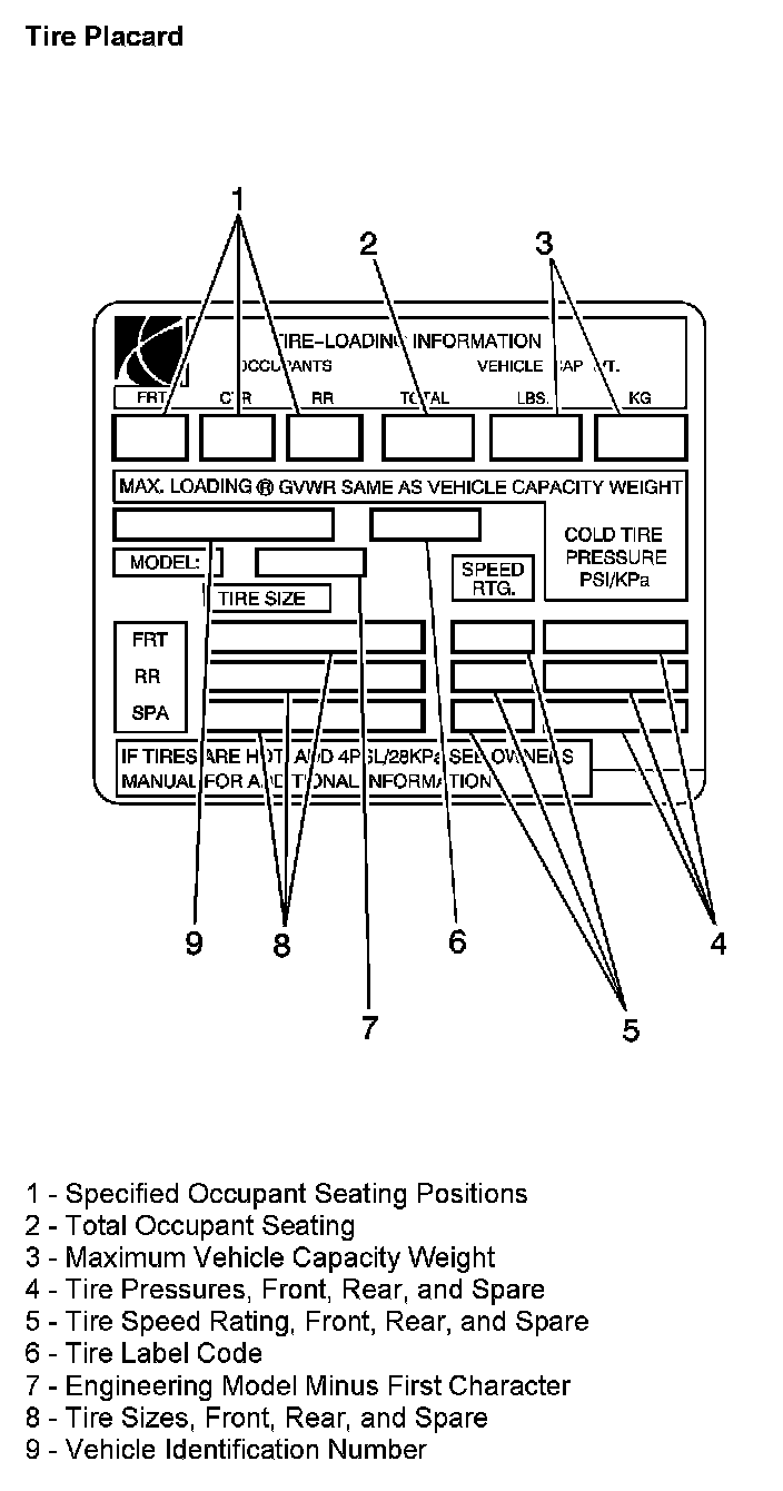 The Tire Placard label is located on the left rear door. Refer to the placard in order to obtain the following information: