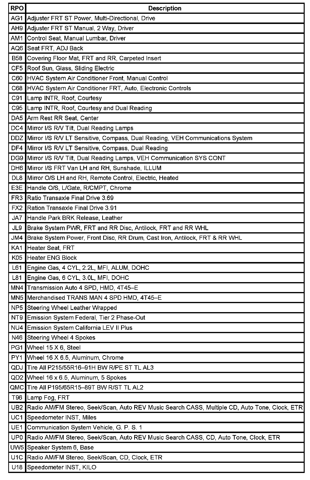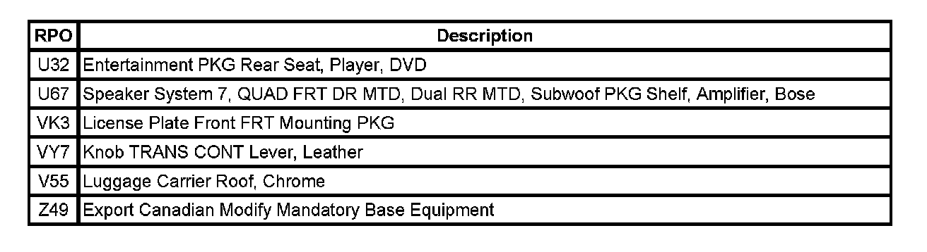 The table provides the description of the Regular Production Option (RPO) codes that are available on the vehicle. The vehicle's RPO list is printed on the Service Parts Identification Label.