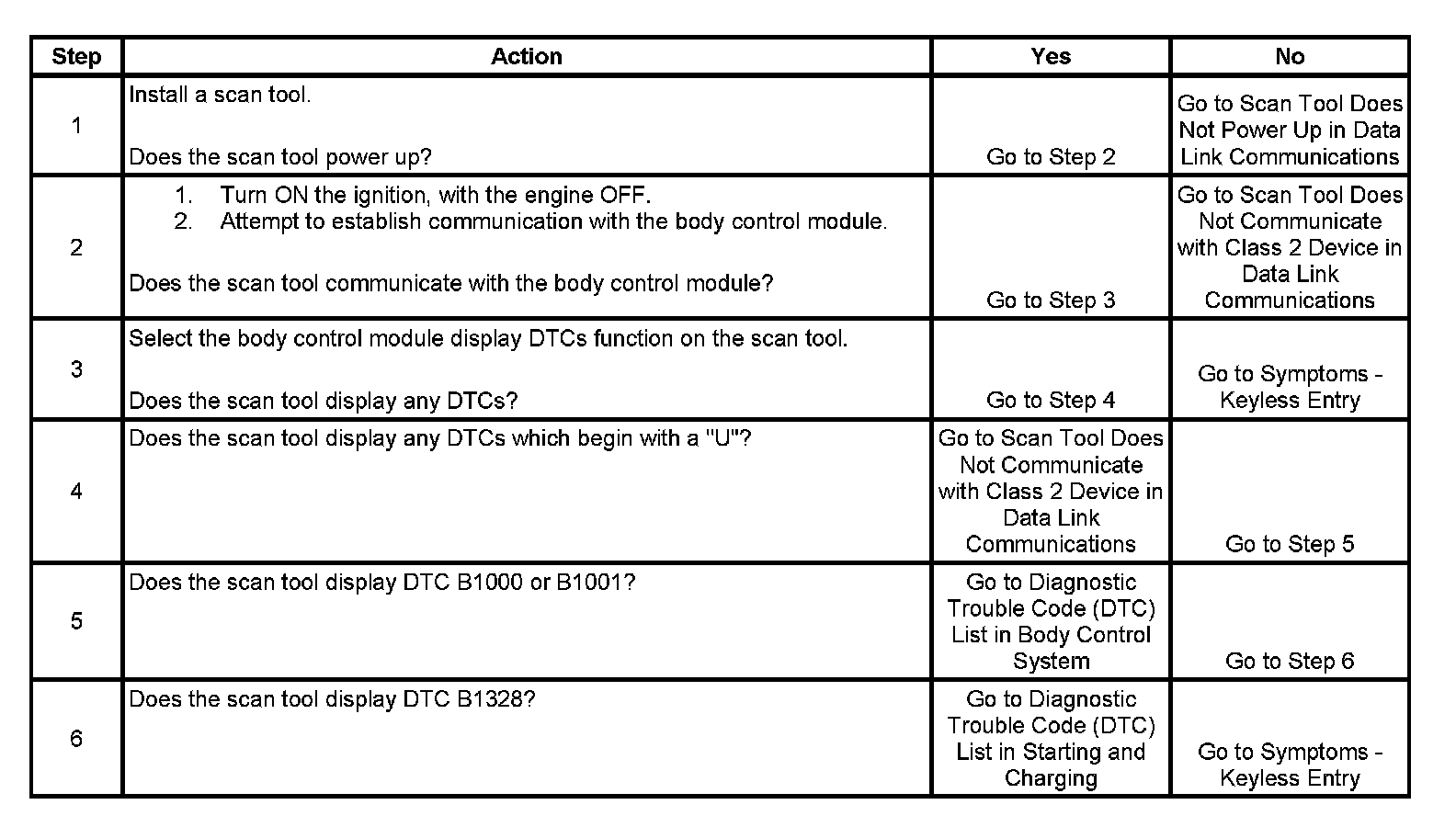 6. At this point you have determined all DTCs applicable to the Keyless Entry system. Refer to Symptoms - Keyless Entry for further keyless entry diagnosis. Any other body control module DTCs displayed do not apply to keyless entry and should be diagnosed in their applicable section. Symptom Related Diagnostic Procedures