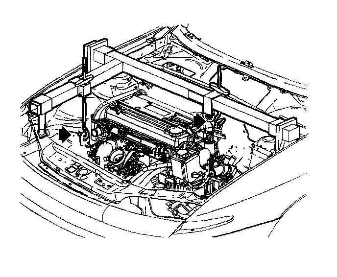 1. Place the engine support fixture long bar, from the SA9105E across the engine compartment.