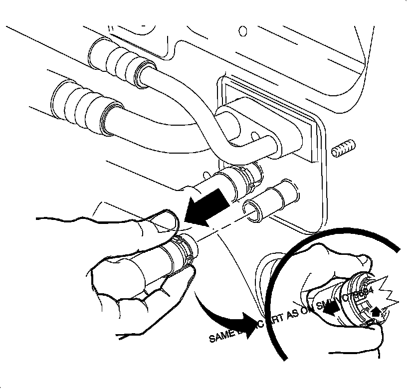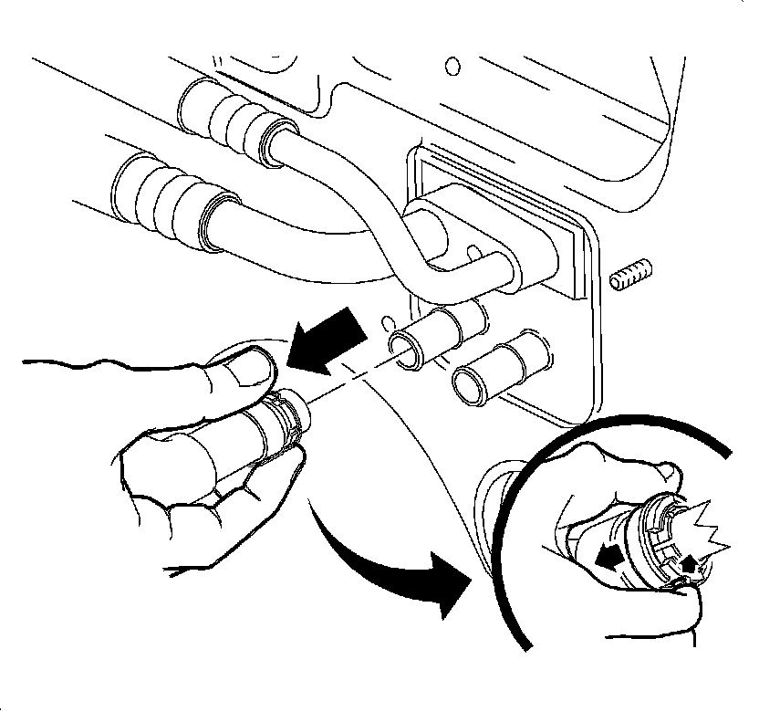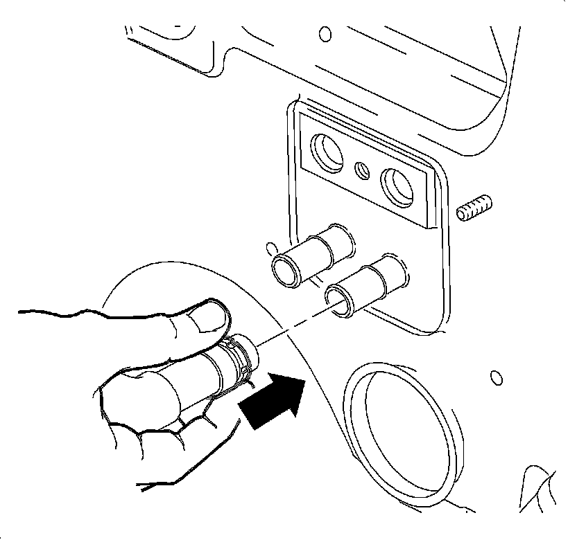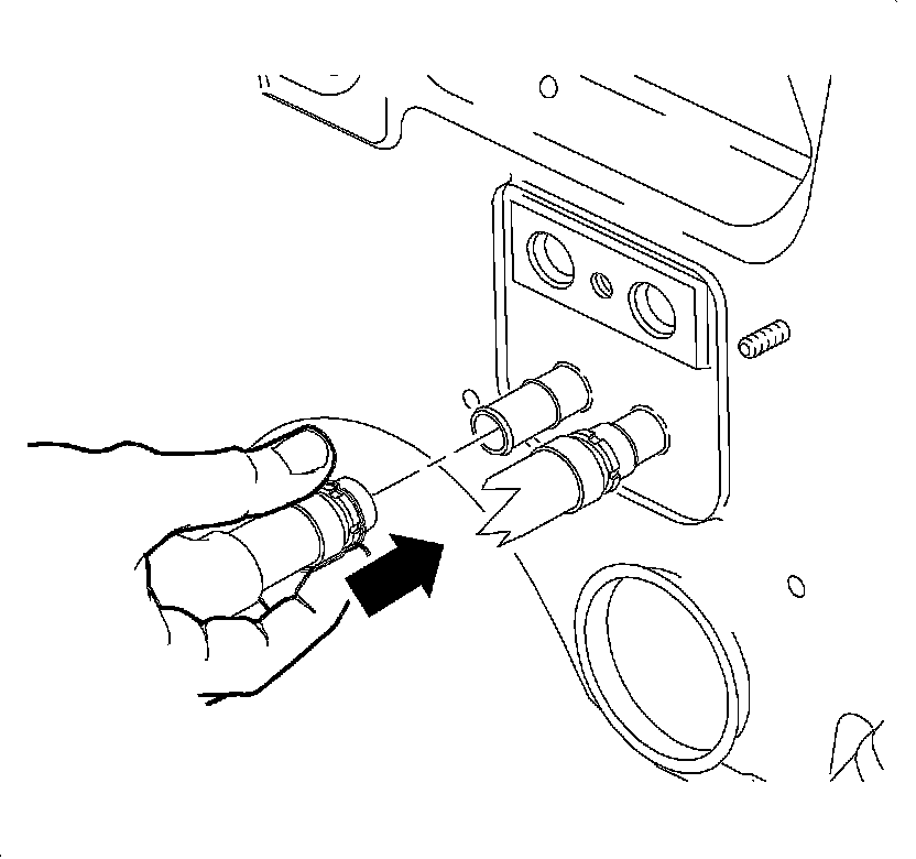 1. Hold the hose by black quick connect collar and slide the hose onto the heater core pipe until the quick connect collar engages over the bead on the heater core pipe.