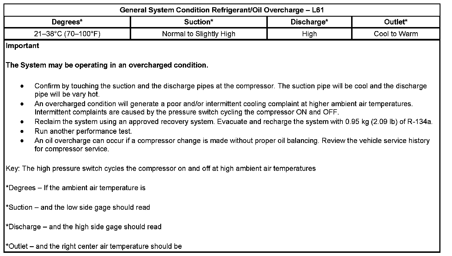 General System Condition Refrigerant/Oil Overcharge: