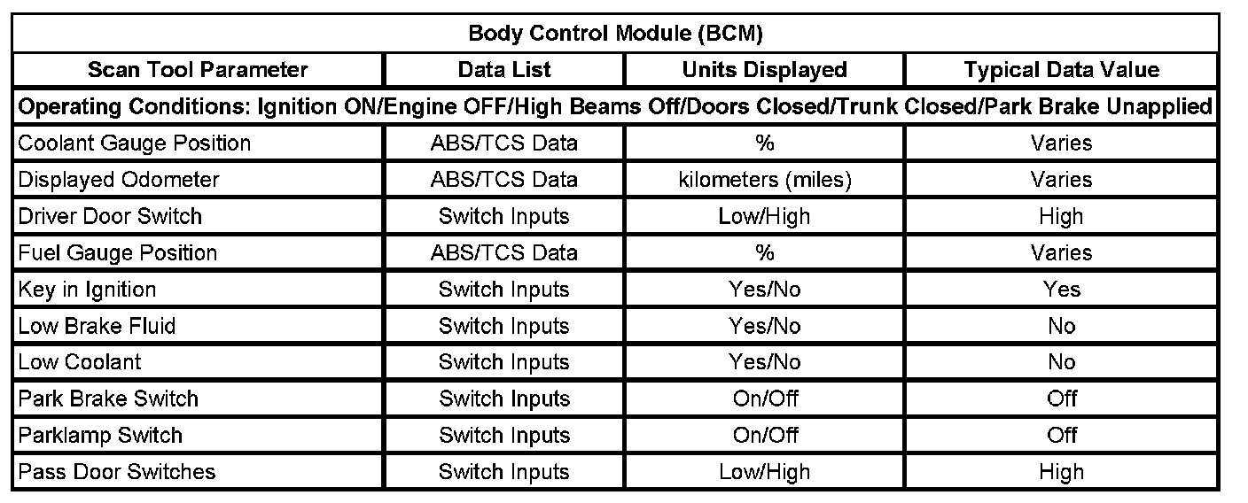 Scan Tool Data List - Body Control Module (BCM)