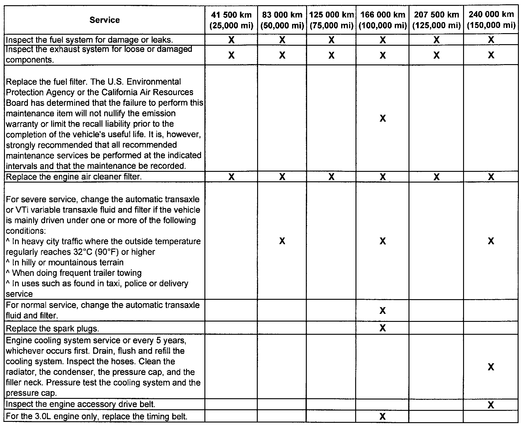 (Maintenance I or Maintenance II) after the indicated kilometers (miles) shown for each item.