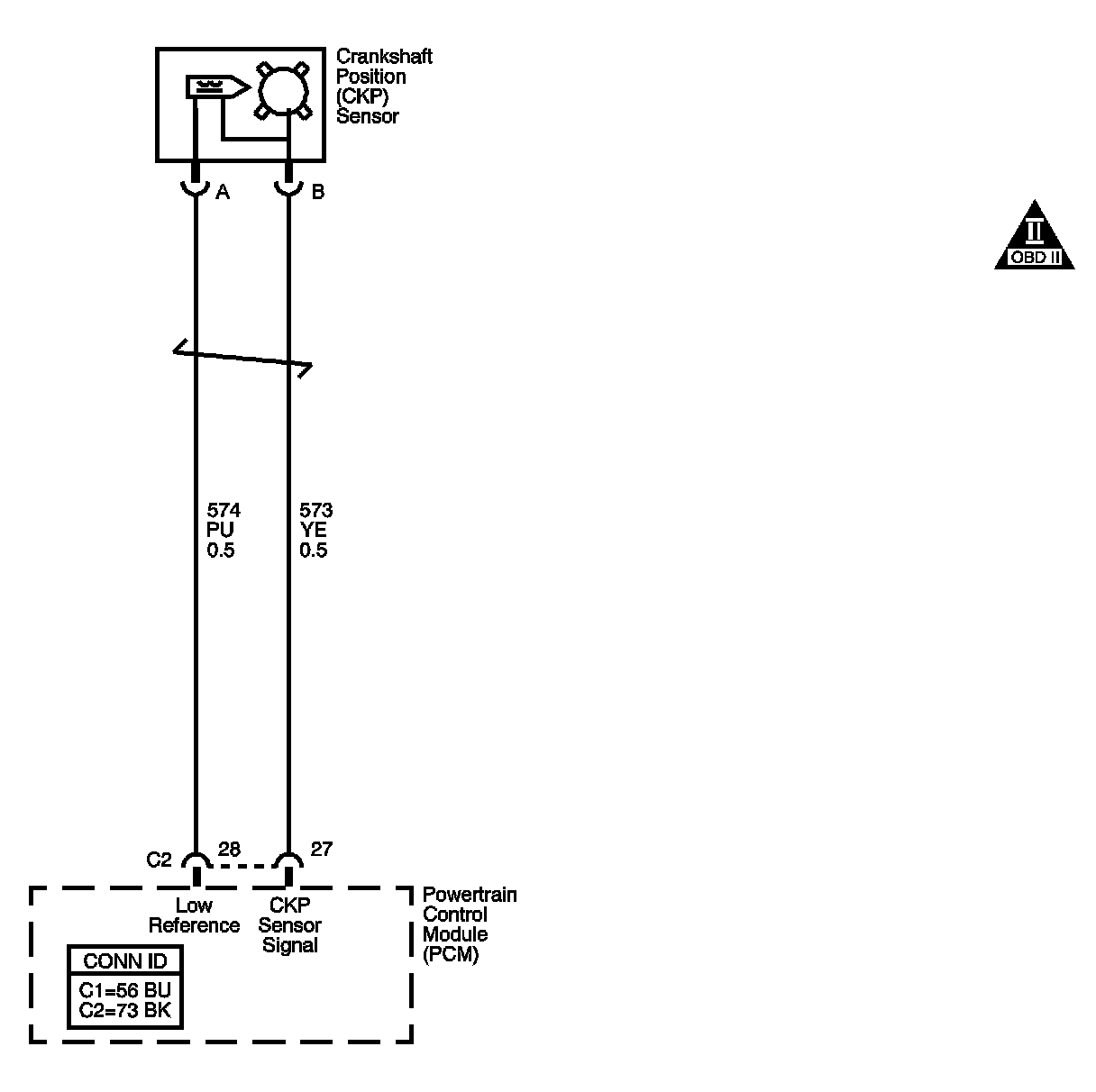 The crankshaft position (CKP) sensor is a variable reluctance sensor. The crankshaft position (CKP) sensor indicates the crankshaft speed and position. The CKP sensor produces an AC voltage of different amplitude and frequency. The frequency depends on the velocity of the crankshaft. The AC voltage output depends on the crankshaft position and battery voltage. The CKP sensor works in conjunction with a 7X reluctor wheel attached to the crankshaft. The CKP sensor connects to the powertrain control module (PCM) through the following circuits: