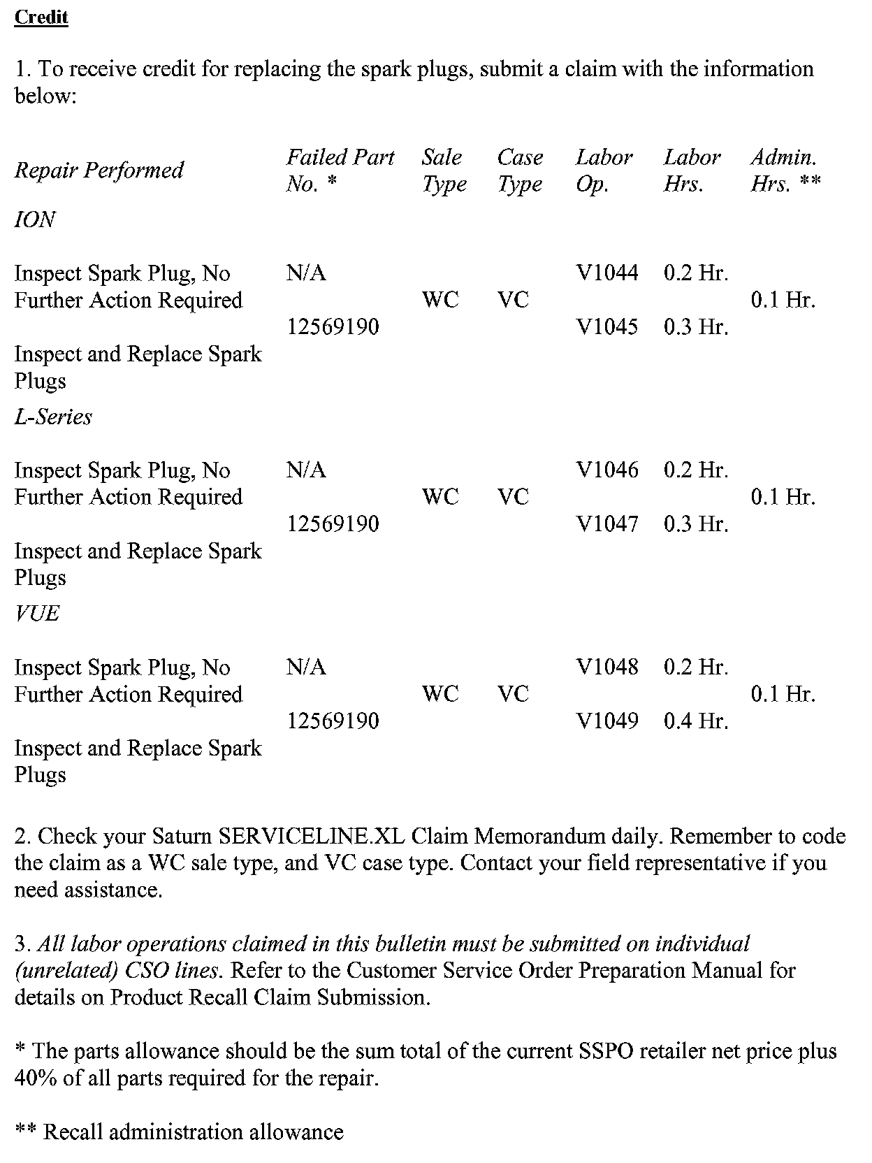 A pre-shipment of spark plugs required to perform this recall will be automatically sent to you from Saturn Service Parts Operations (SSPO) based on the affected vehicle population at your retail facility.