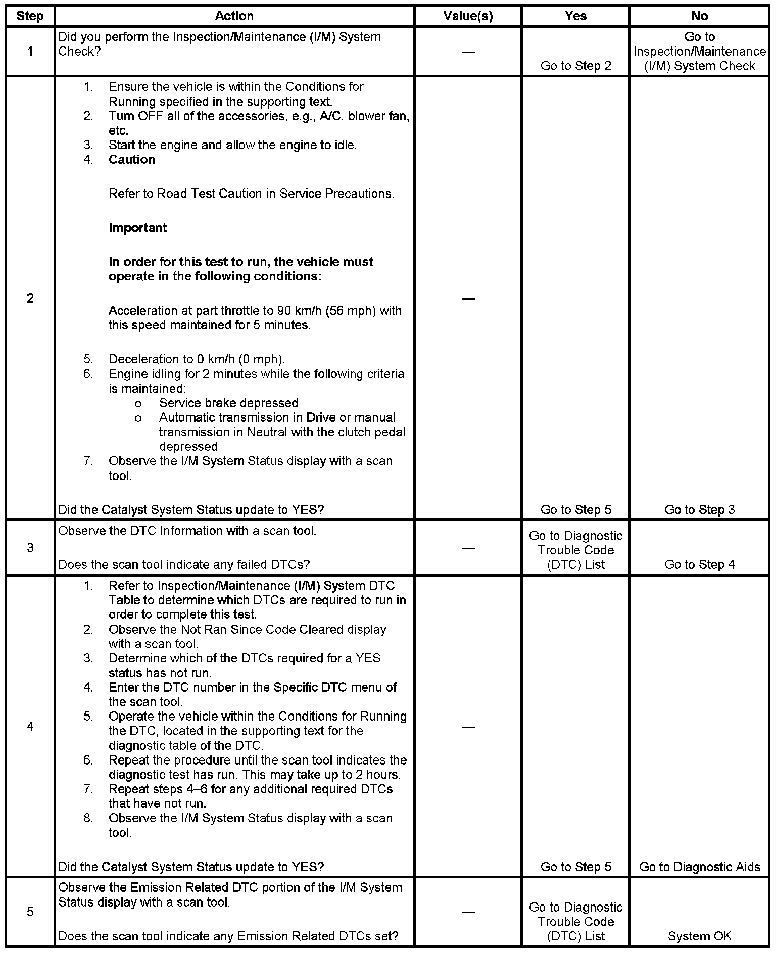 The purpose of this test is to satisfy the enable criteria necessary to execute I/M readiness diagnostics for the catalyst system. The test may be used to set the I/M System Status indicators to YES. The I/M System Status Display on the scan tool provides an indication of whether the control module has completed the required tests. I/M System Status does not indicate that the tests have passed or failed. When all of the diagnostics for a specific system have run and passed I/M System Status will update to YES. If a test for a specific system has failed, the I/M System Status will update to YES, indicating a determination was made, even if all of the other tests for that system have not run.