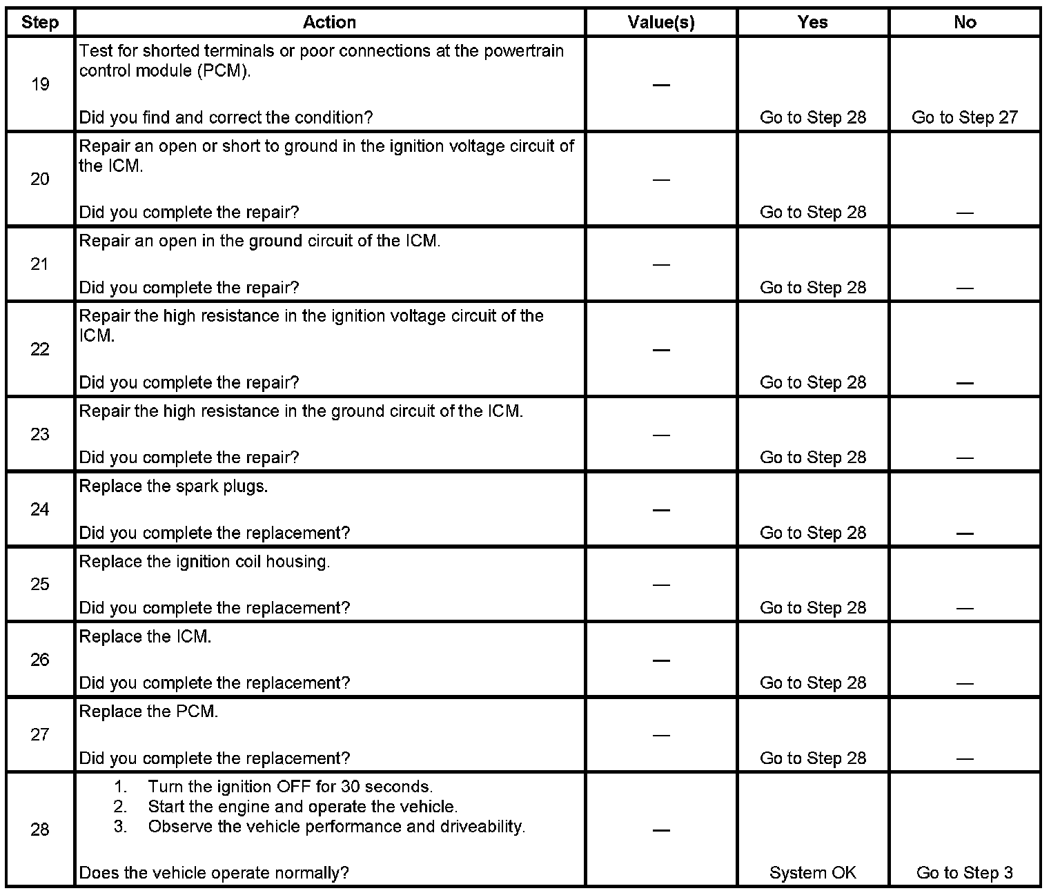 Each ignition coil supplies secondary voltage to a pair of spark plugs. This is called a waste spark ignition system. The powertrain control module (PCM) supplies a signal on each of the ignition control (IC) timing control circuits to the ignition control module (ICM). The ICM fires the correct ignition coil at the correct time based on the signals. The ICM detects if cylinder 1 or cylinder 3 is on the compression stroke by sensing the secondary voltage and polarity of each side of the ignition coil. The ICM detects this voltage with sensing circuitry integrated into each ignition coil. The higher voltage is on the compressing cylinder. This is called compression sense ignition. The ICM provides a synthesized cam signal to the PCM based on these inputs. The PCM uses the cam signals to synchronize fuel injection.