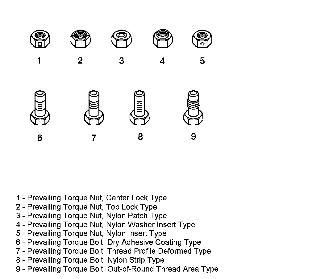 These fasteners accomplish the thread interface by the presence of a thread-locking compound on the fastener threads. Refer to the appropriate repair procedure in order to determine if the fastener may be reused and the applicable thread-locking compound to apply to the fastener.
