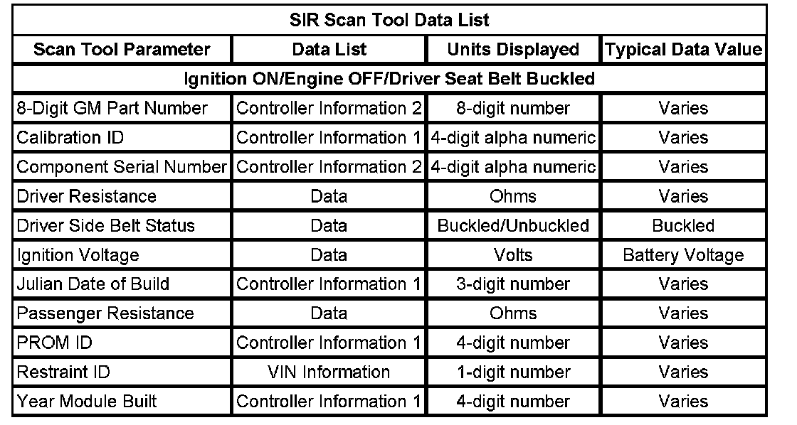 The SIR Scan Tool Data List contains all the restraint system related parameters that are available on the scan tool. The parameters in the list are arranged in alphabetical order. The column, Data List, indicates the location of the parameter within the scan tool menu selections.