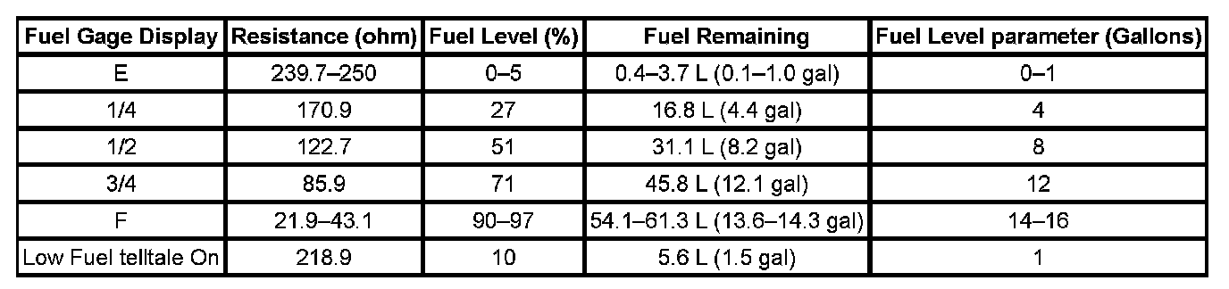 FUEL LEVEL SPECIFICATIONS